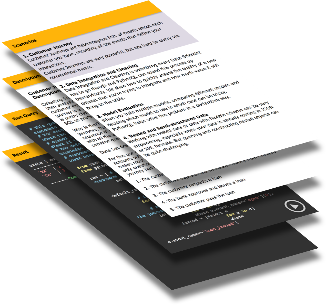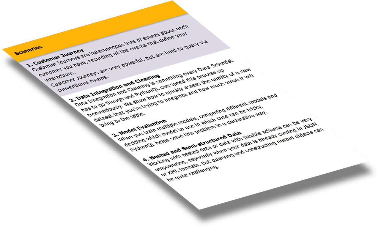 We've taken the best from the query languages such as SQL, OQL, XQuery and JSONiq and addded it all to Python. Now you can run powerful declarative queries right inside Python on top of databases, files or your own collections.